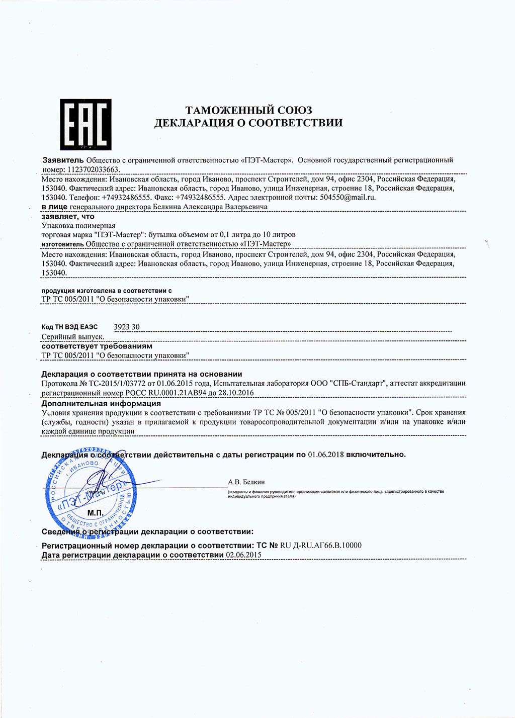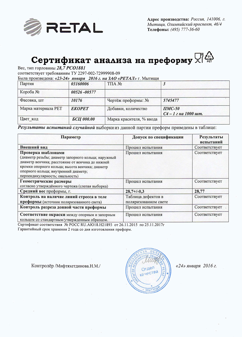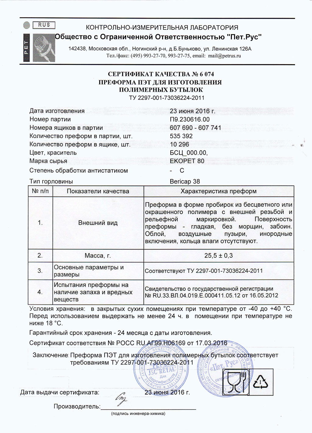 • Изготавливаются только из импортного сырья 1-й категории качества компаний Retal, Resilux и Europlast.