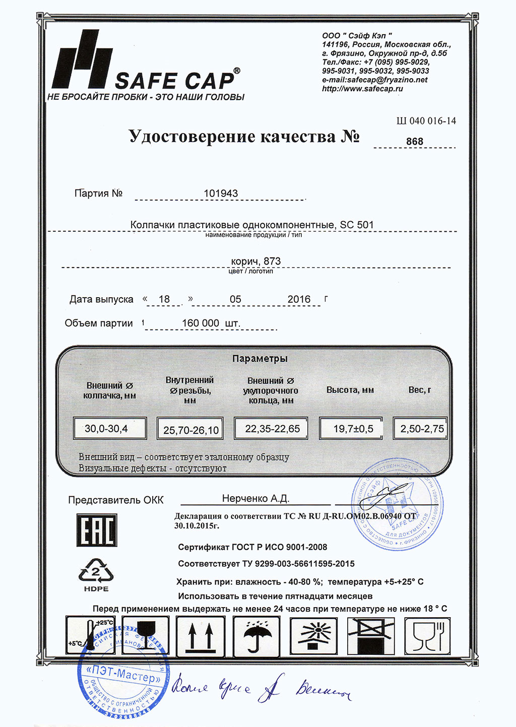 • Выпускаются по новейшему стандарту PCO 1881, что позволяет снизить конечную стоимость бутылки и экономить Вам, используя облегченный колпачок.